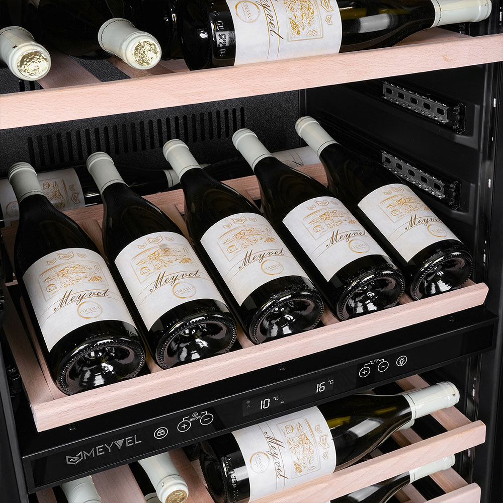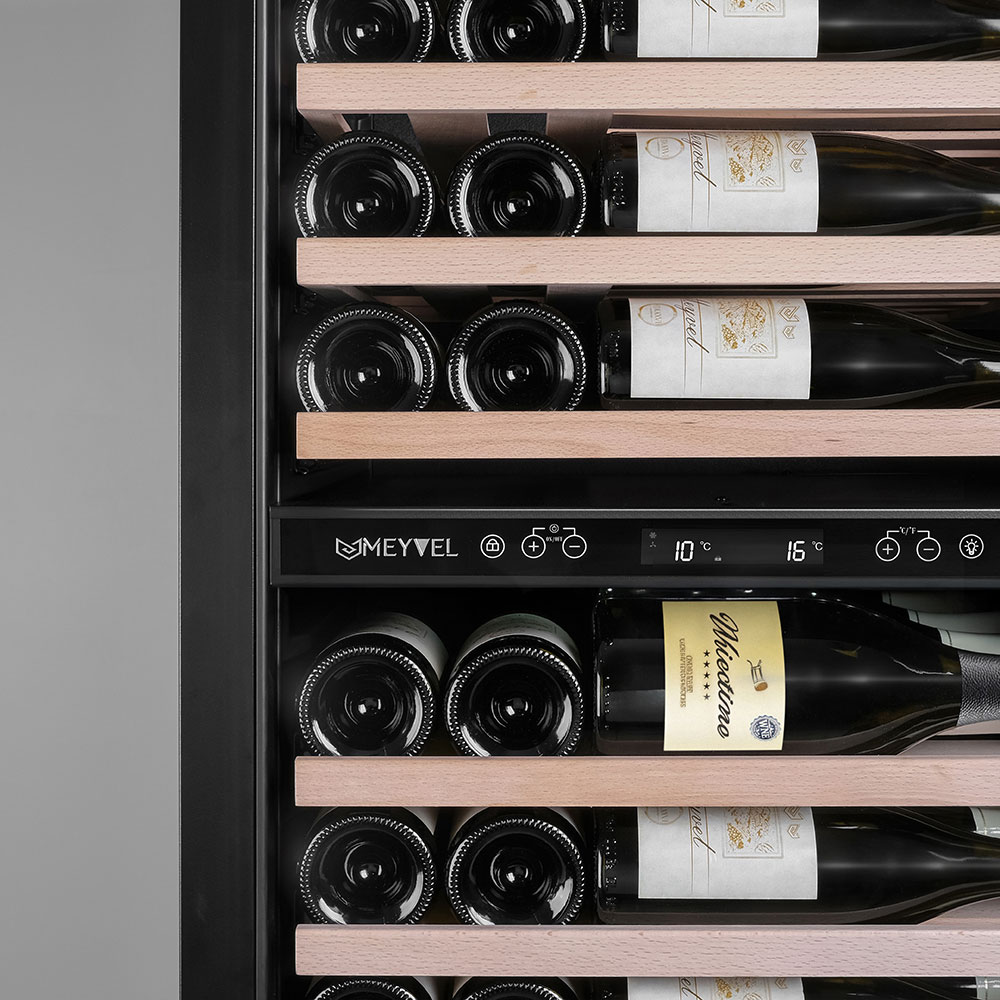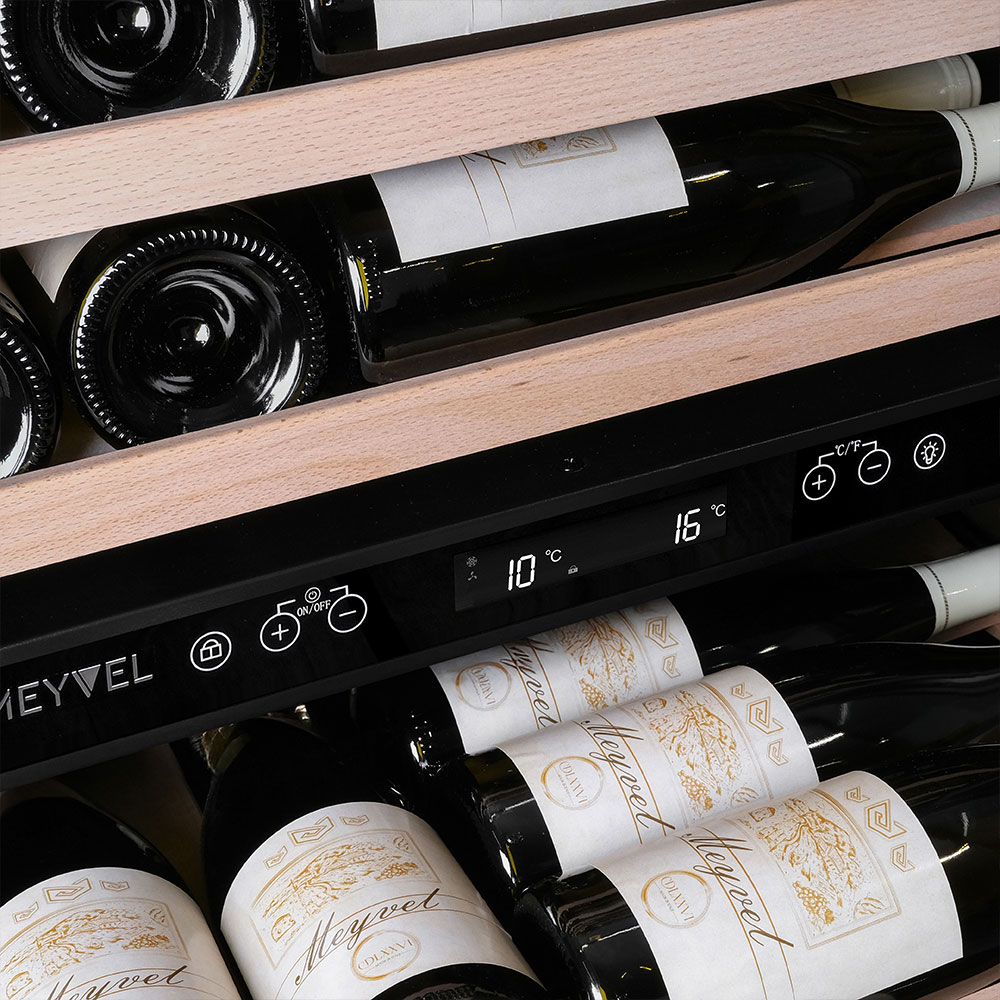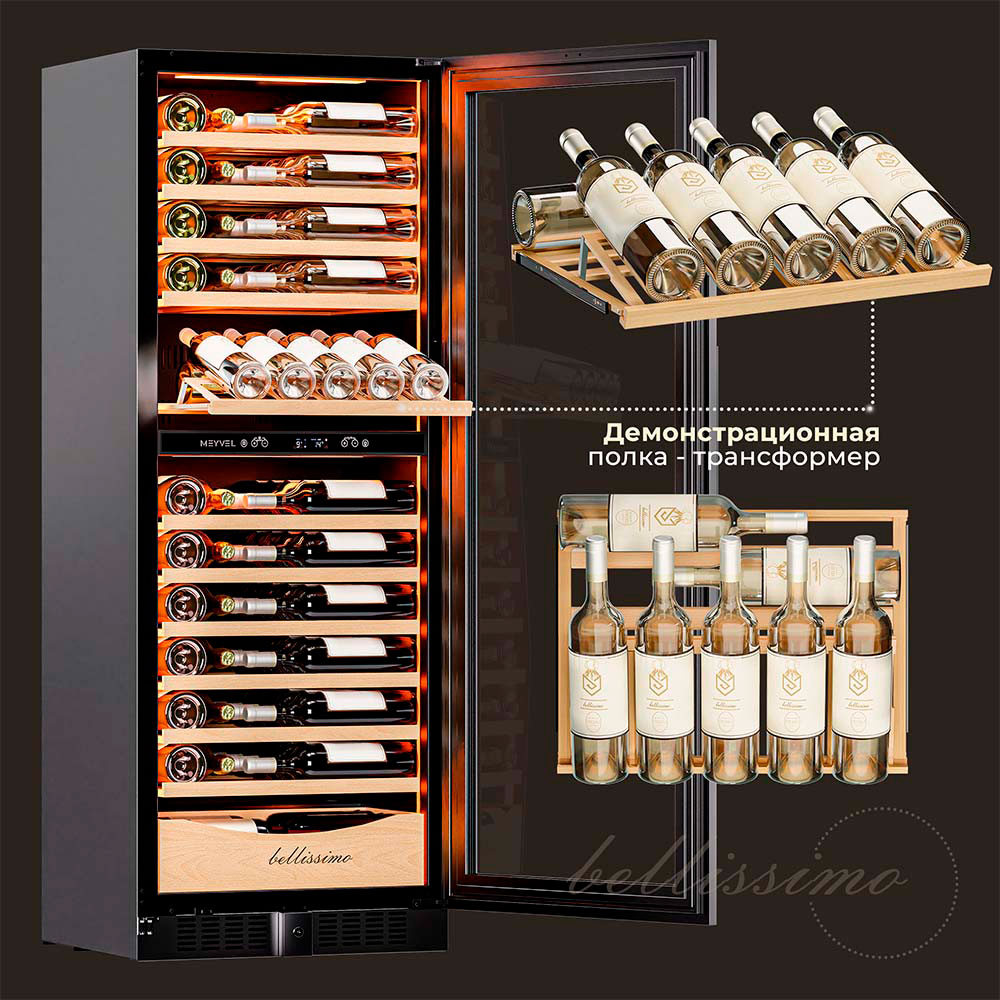 Винный холодильник Meyvel MV95-KBT2 (Slim) с двумя температурными зонами вмещает 95 бутылок. Подходит для хранения стоящих вертикально, а также нестандартных бутылок. Есть демонстрационная полка-трансформер. Внизу — ящик для аксессуаров или вин.
