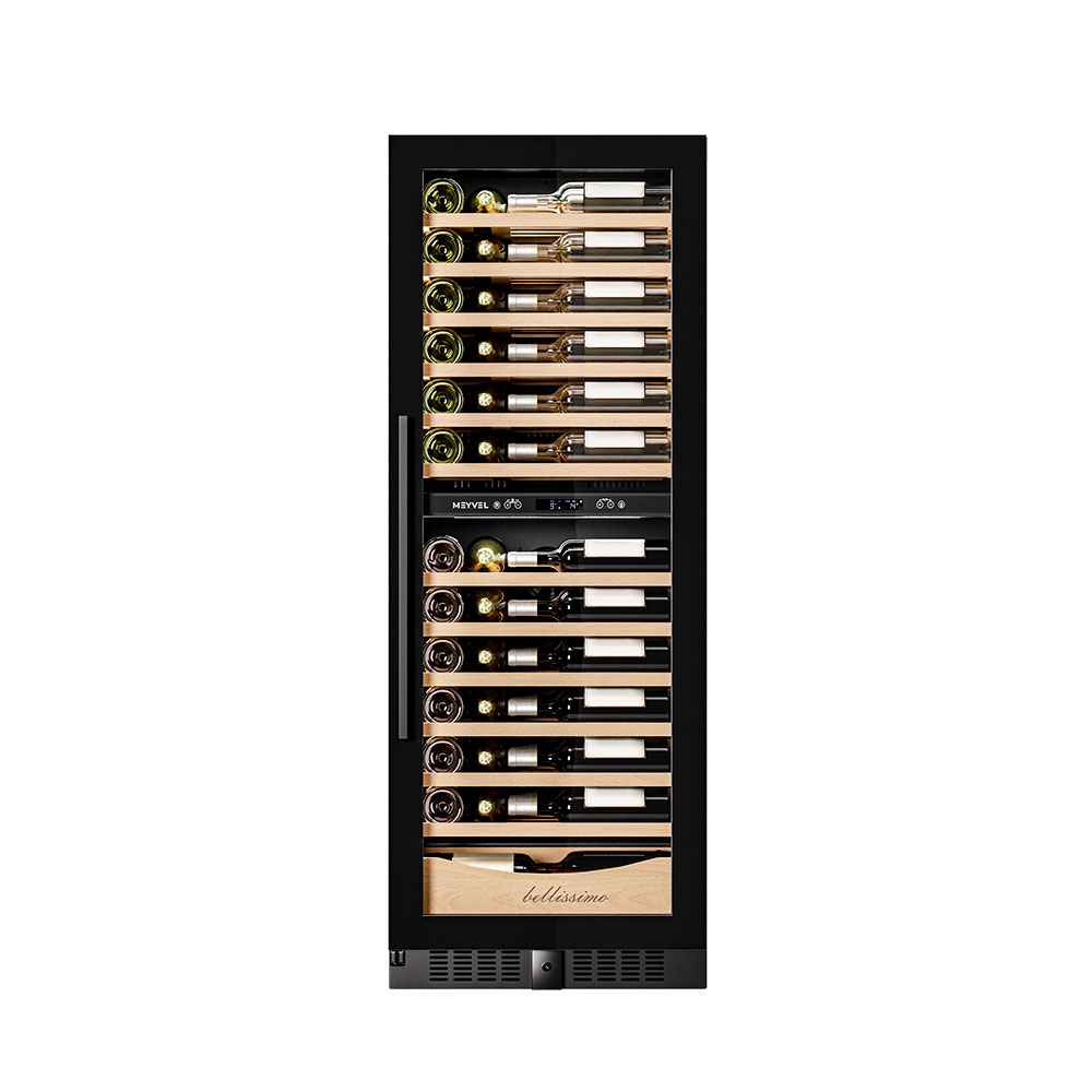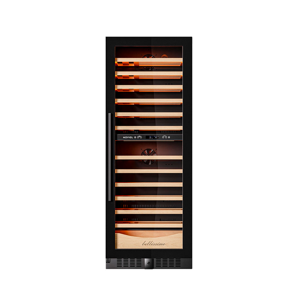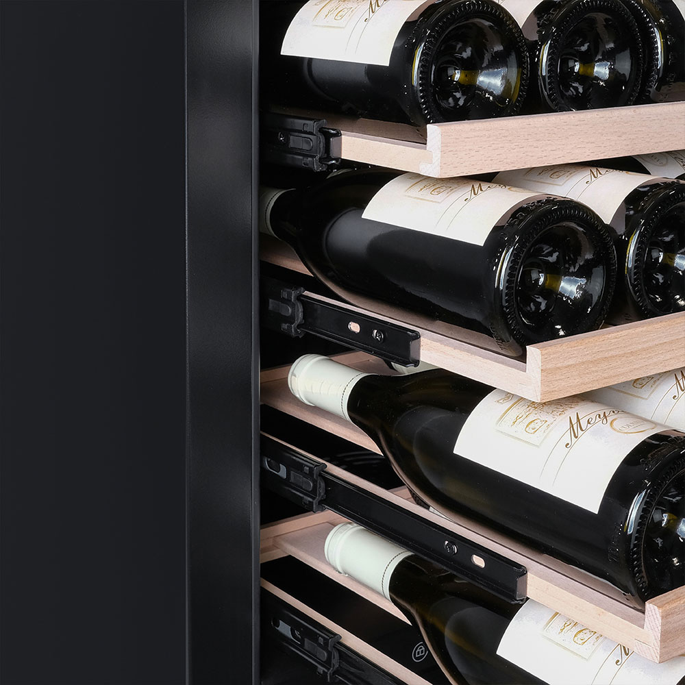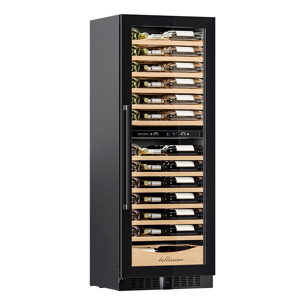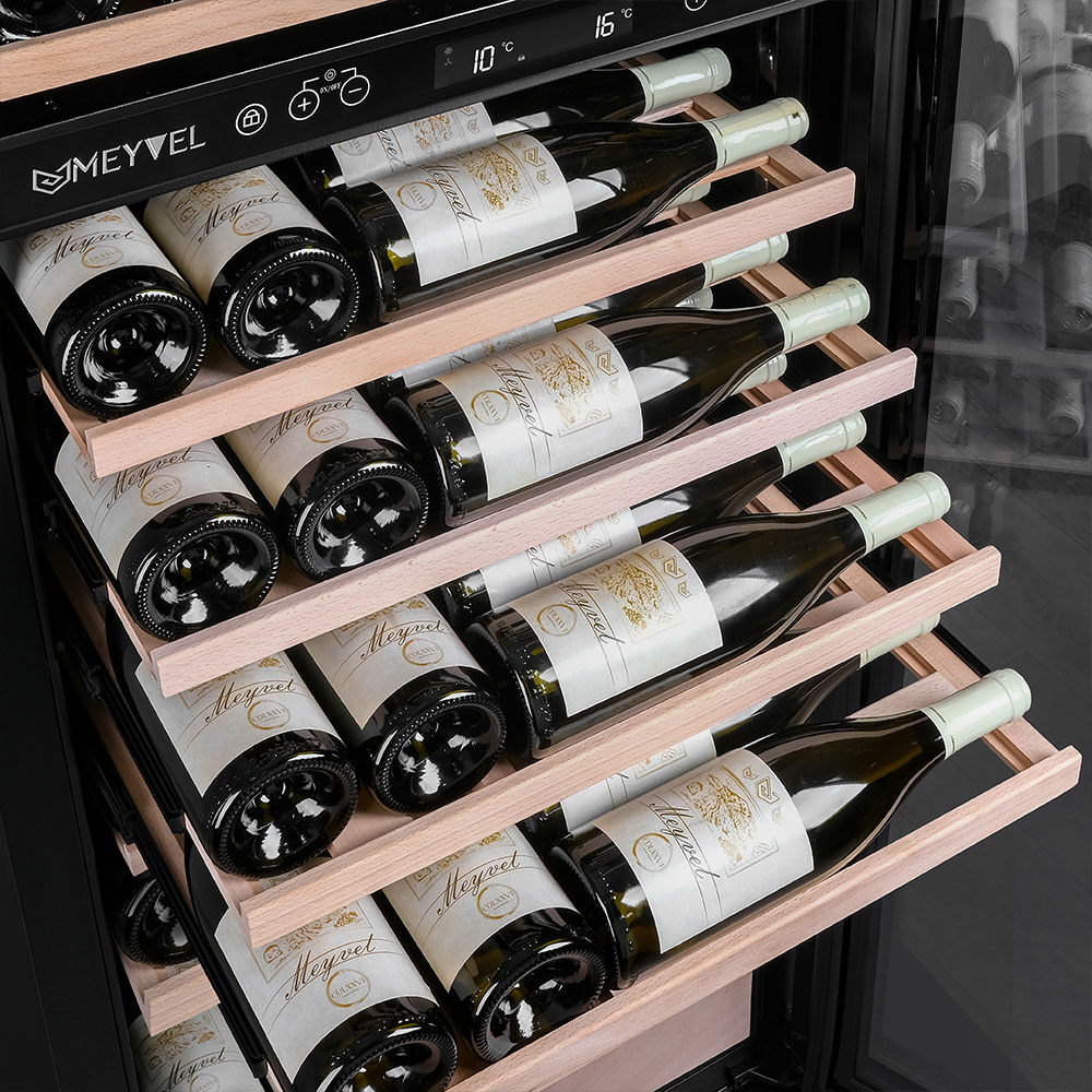 Винный холодильник Meyvel MV95-KBT2 (Slim) с двумя температурными зонами вмещает 95 бутылок. Подходит для хранения стоящих вертикально, а также нестандартных бутылок. Есть демонстрационная полка-трансформер. Внизу — ящик для аксессуаров или вин.