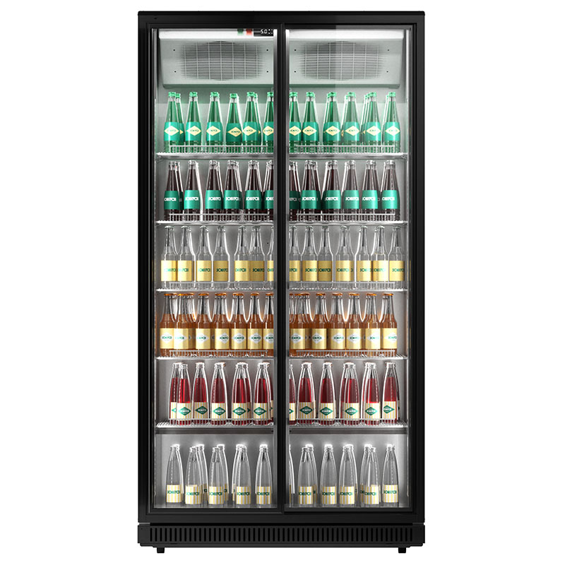 Холодильный шкаф POLAIR V1100 рассчитан на торговлю охлажденными напитками. Одна большая камера объемом 1100 литров разделена на 2 отделения. Способ доступа — 2 двери-купе. В каждом отделении по 5 металлических полок с бортиками, по своему вентилятору для распределения воздуха. Температура задается для всей камеры, настраиваемый диапазон от +3 до +8 °С. Управление — электронный терморегулятор.