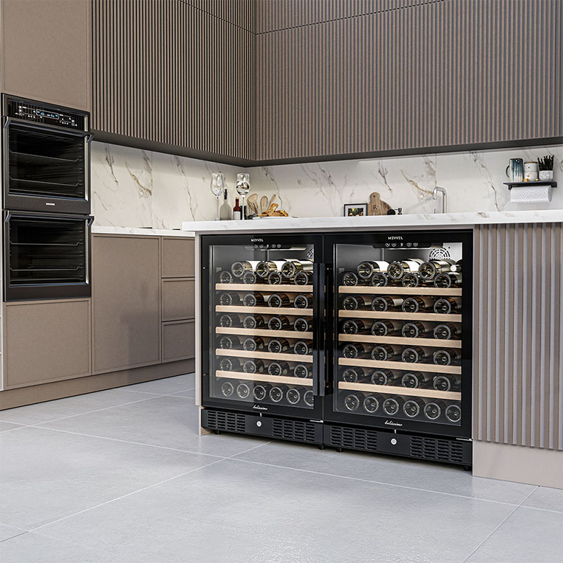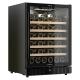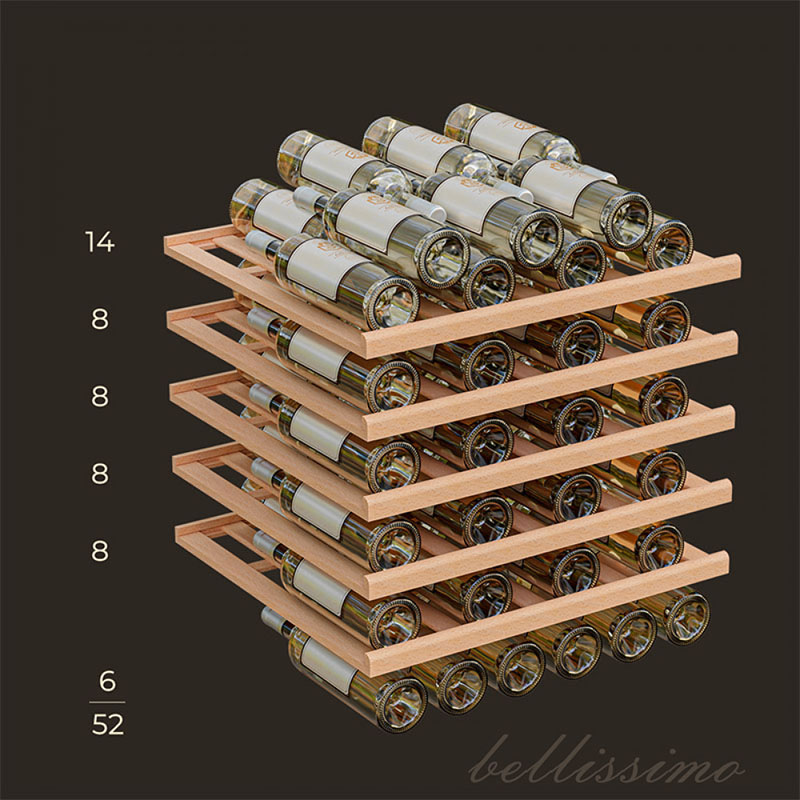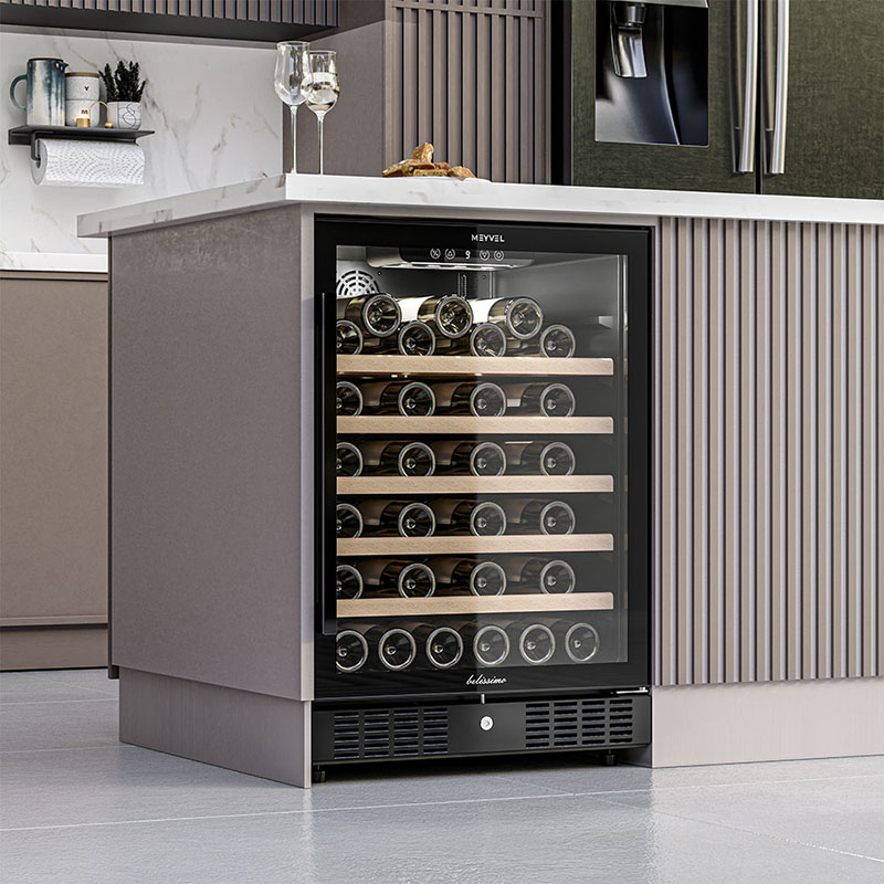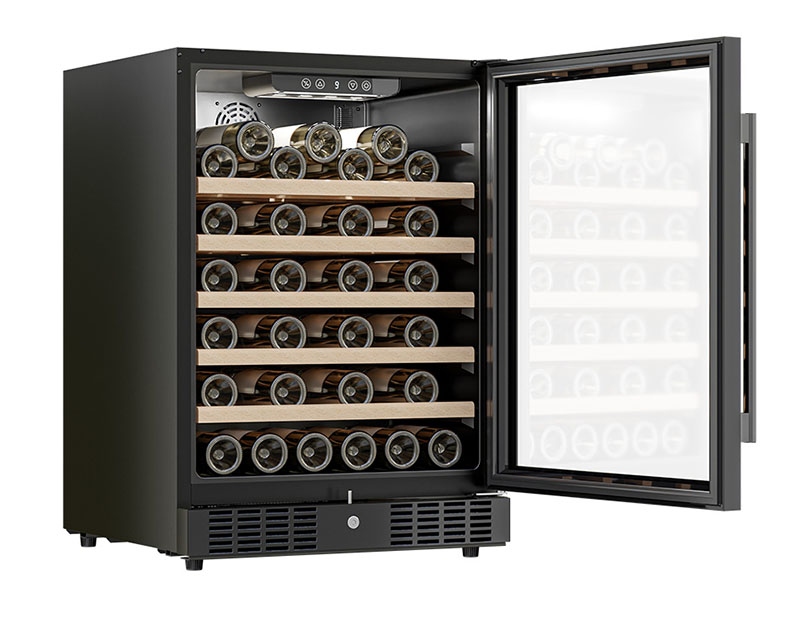 Винный шкаф Meyvel MV52-KBT1 способен вместить 52 бутылки типа «Бордо». Температура регулируется в диапазоне от +5 до +18 °С. Поддерживается оптимальная влажность. Распределение воздуха принудительное, за счет встроенного вентилятора. Управление электронное. Для задания параметров в камере размещена панель управления с сенсорными кнопками. Есть верхняя LED подсветка, она может работать в режиме презентации (то есть постоянно).
