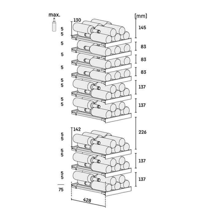 - Вмещает до 75 стандартных винных бутылок, подходит для хранения бутылок другого размера.
