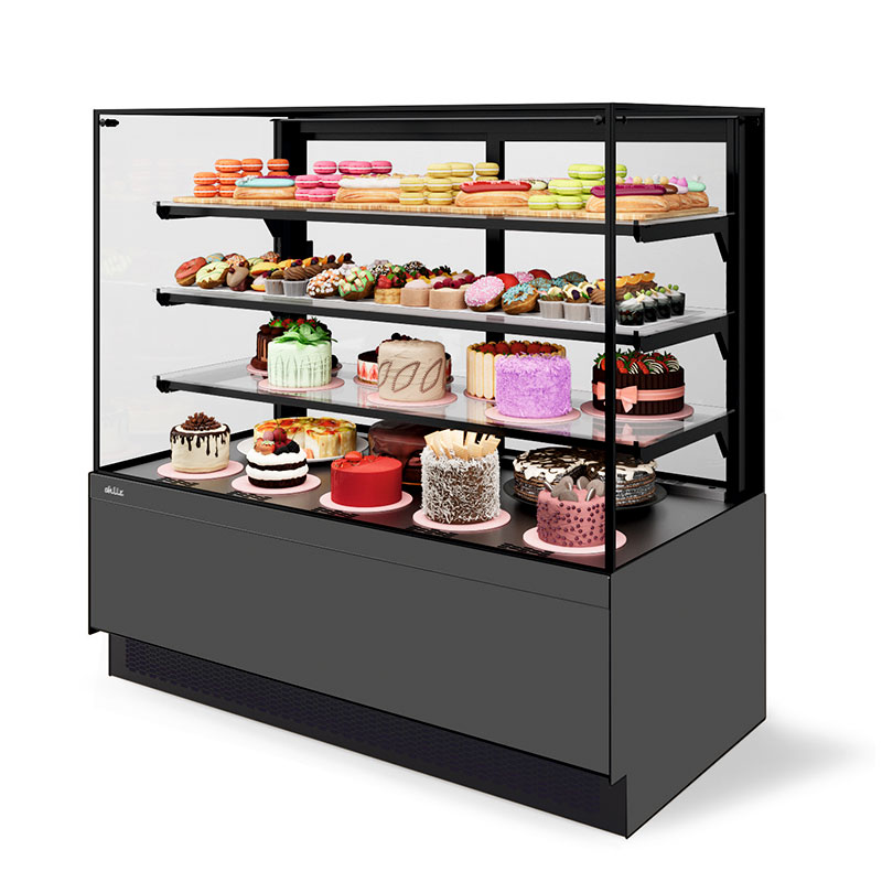 Кондитерская витрина CHILZ Vete II Kub Lux 130 серый матовый разработана для больших и средних кондитерских и магазинов, демонстрации десертов в кафе. Ее полезный объем 0,3 куб. м, площадь выкладки 1,93 кв. м. Безрамочное структурное остекление стеклопакетами со всех сторон гарантируют отличную обзорность. Охлаждение циркуляционного типа разгоняет холодный воздух по всему объему. Соблюдение заданных параметров обеспечивает цифровой блок управления.