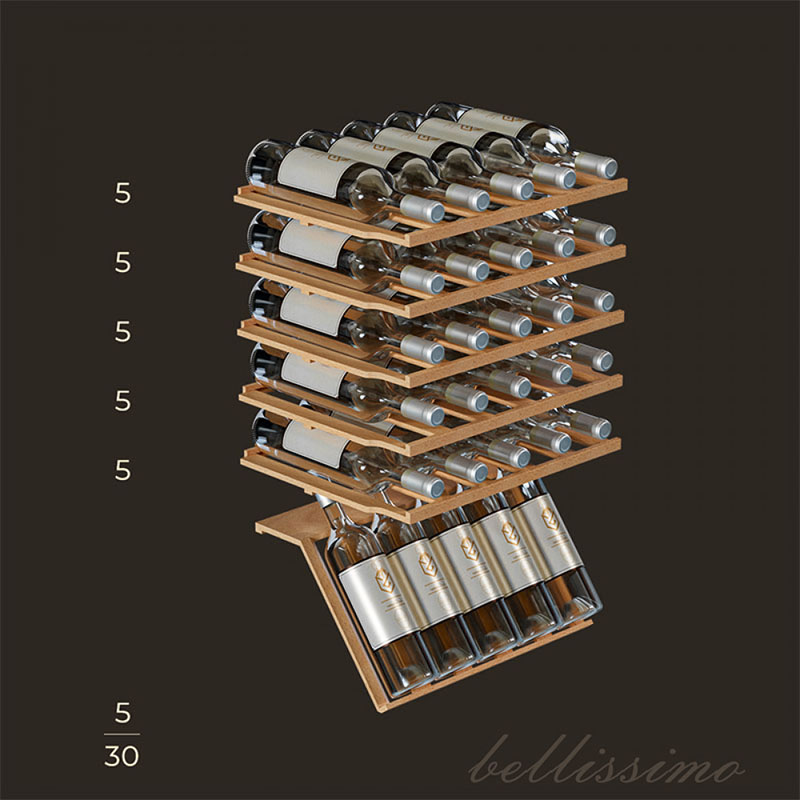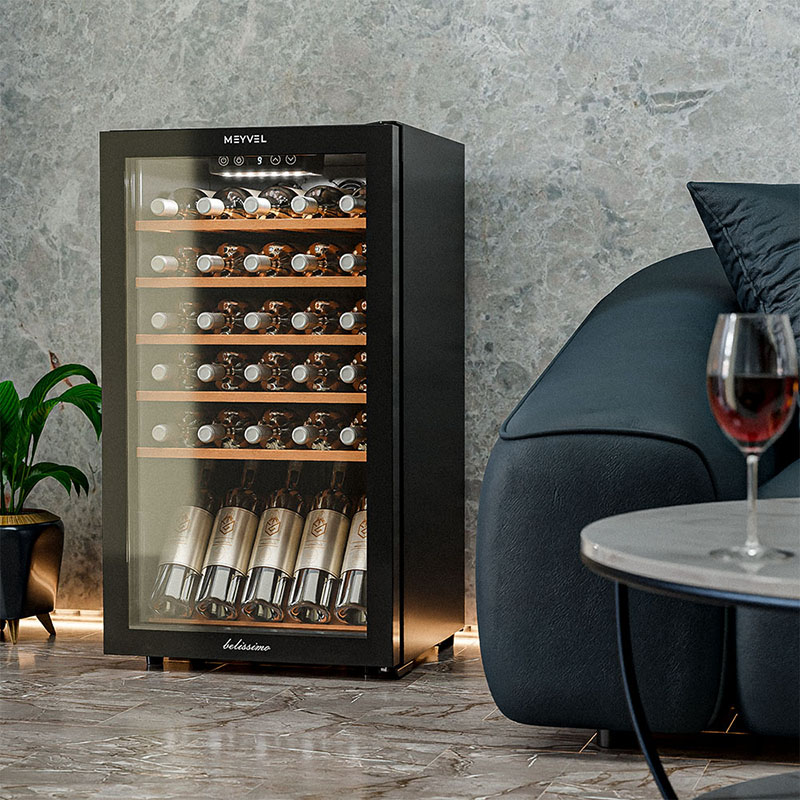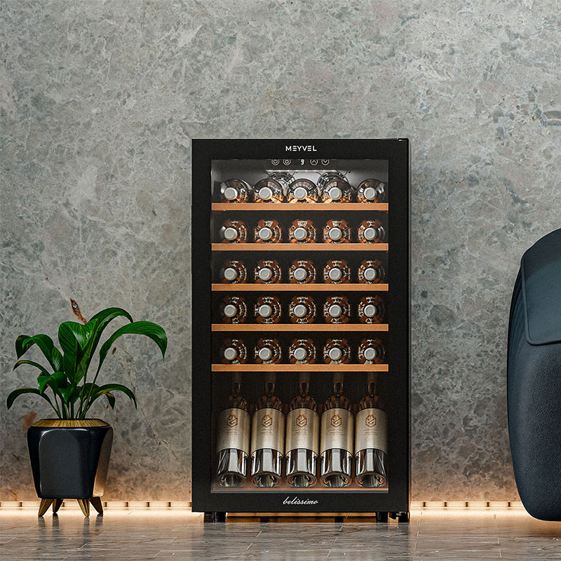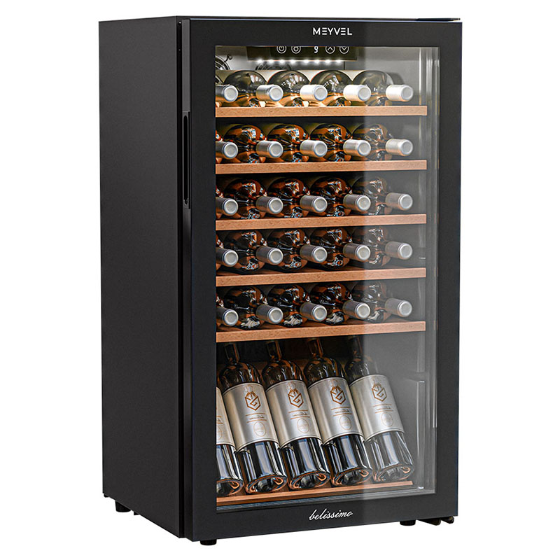 Винный шкаф Meyvel MV33-KBF1 соответствует современным требованиям к винным холодильникам. Поддерживает стабильную температуру в промежутке от +5 до +20 °С, влажность на уровне 60-80%, защищает от ультрафиолета и вибрации. Оснащен LED-подсветкой, пятью выдвижными буковыми полками и одной наклонной демонстрационной полкой. Есть возможность заменить демонстрационную полку дополнительной выдвижной (заказывается отдельно). Или убрать ее и ставить внизу бутылки вертикально.