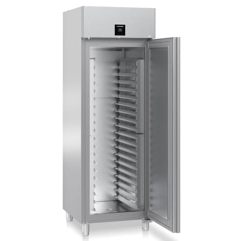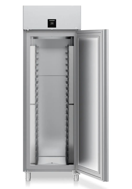 Холодильник для пекарен LIEBHERR BRPSvh 6501 Perfection — это высокотехнологичная техника для оптимального хранения чувствительных продуктов. У нее цифровой блок управления, наружный сенсорный дисплей, реагирующий на касания и жесты пролистывания, система принудительной циркуляции воздуха, развитая система сигнализации. Размораживается автоматически. Функция SuperCool обеспечивает быстрое выравнивание температуры свежих загруженных продуктов с температурой внутри камеры. Блок управления контролирует не только температуру, но и влажность.