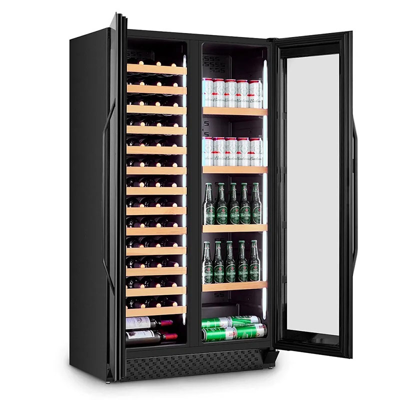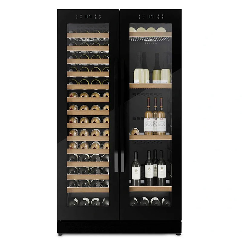 Модель с температурным диапазоном от +5 до +20 °С подходит для хранения вина любого типа, для проведения дегустаций. Может встраиваться или стоять отельно. В камерах есть боковая подсветка. Шкаф снабжен двумя дверцами с тройными стеклами в рамке. Стекла тонированные, с защитным покрытием от уф-излучения. Укомплектован 13-ю полками для бутылок в горизонтальном положении и 4-мя полками для вертикально стоящих бутылок.
